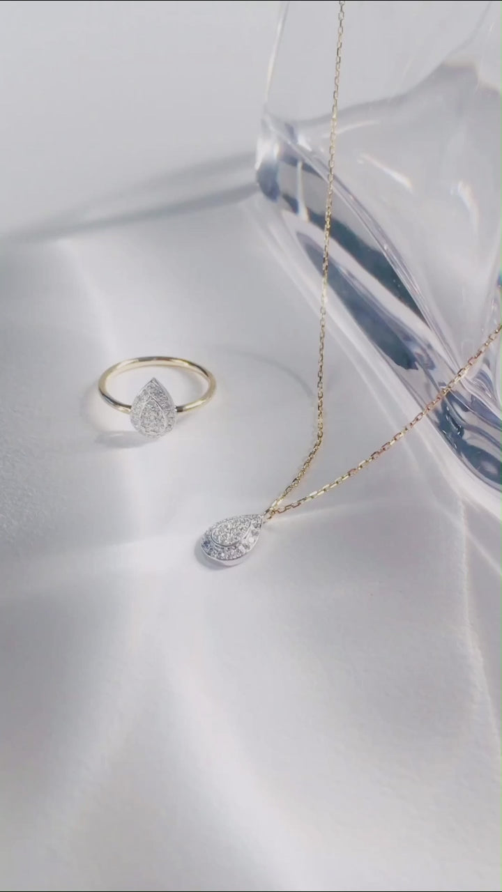 デザイナーのMarie Westonが旅先で心に残ったインドの眩しい太陽の輝きを美しいジュエリーに昇華した、ダイヤモンドが主役のシリーズ「Indian Inspiration」。ダイヤモンドをパヴェ状にあしらった華やかさと、イエローゴールドホワイトゴールドのコンビネーションが目を惹くネックレスは、洗練された大人の女性の首元によく似合います。他のアクセサリーやファッションともコーディネートしやすいのも特徴です。「輝くしずく」は、光に照らされた朝露や歓喜の涙を思わせる幸運モチーフ。瑞々しさ溢れる輝きで、幸せを引き寄せてくれるようなデザインです。45cmのレングスは首に沿う程よい長さで、デコルテを美しく引き立ててくれます。アジャスター付きで、長さを調節できます。