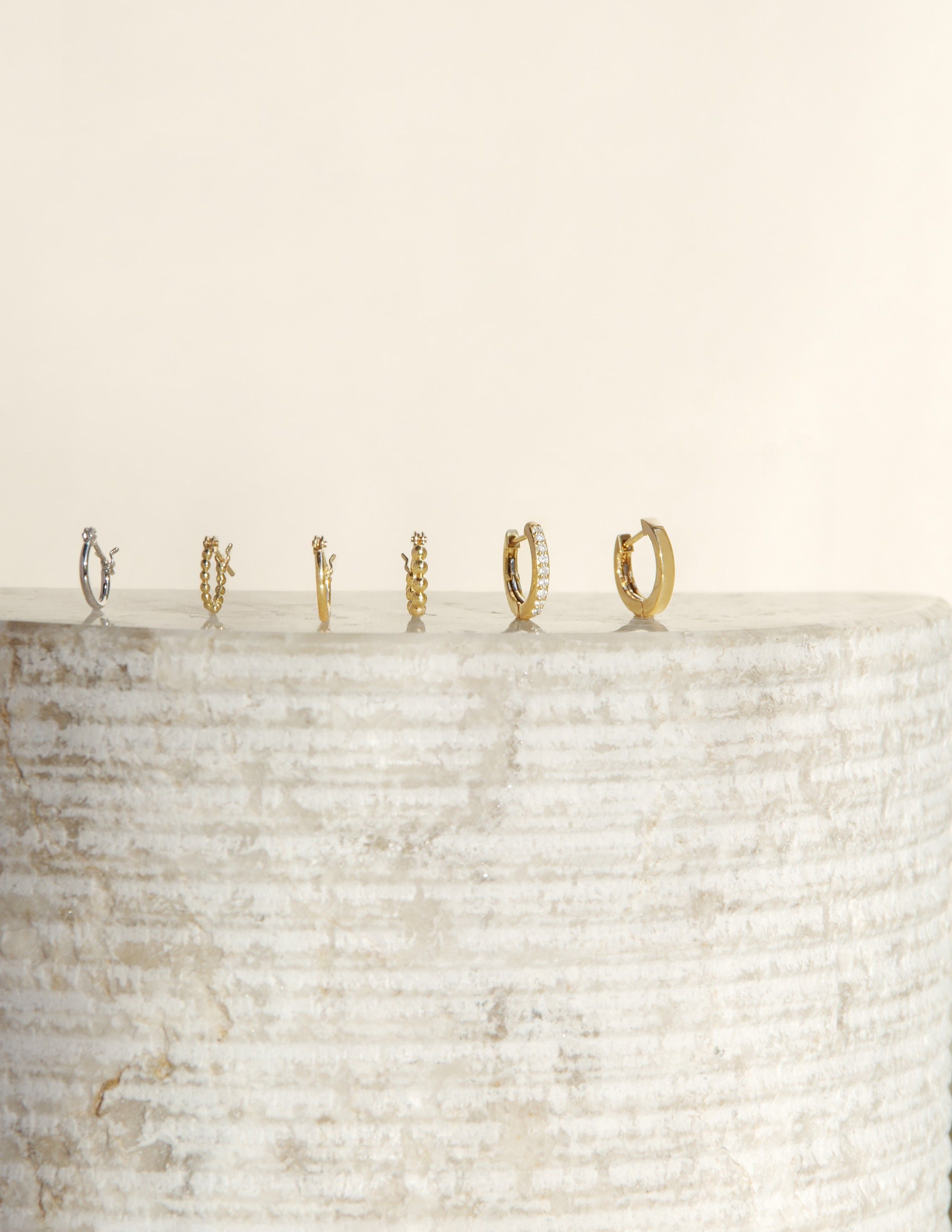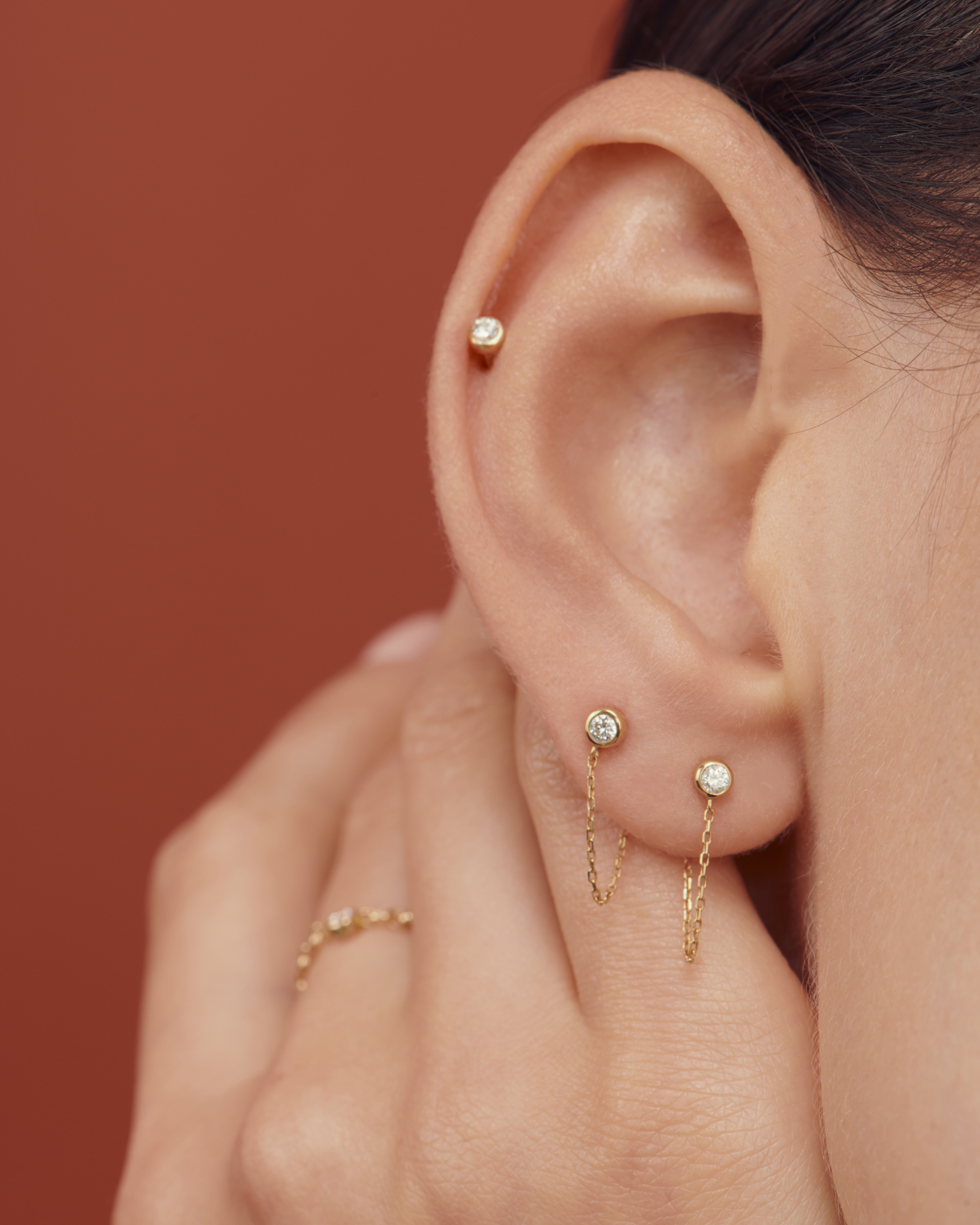画像左から 朝露 スタッドピアス トリプル 59,400円(税込) / 朝露 スタッドピアスピアス トライアングル 59,400円(税込) / 願い星 スタッドピアス 92,400円(税込) / Silent Moon Gold スタッドピアス S 84,700円(税込) / 願い事 フープピアス SSS ドット S 片耳 60,500円(税込) / 願い事 フープピアス SSS(片耳) シャイン YG 23,100円(税込) / 願い事 フープピアス SSS ドット M 片耳 79,200円(税込) / Indian Inspiration クリッカーピアス 176,000円(税込) /絆 クリッカーピアス 159,500円(税込)