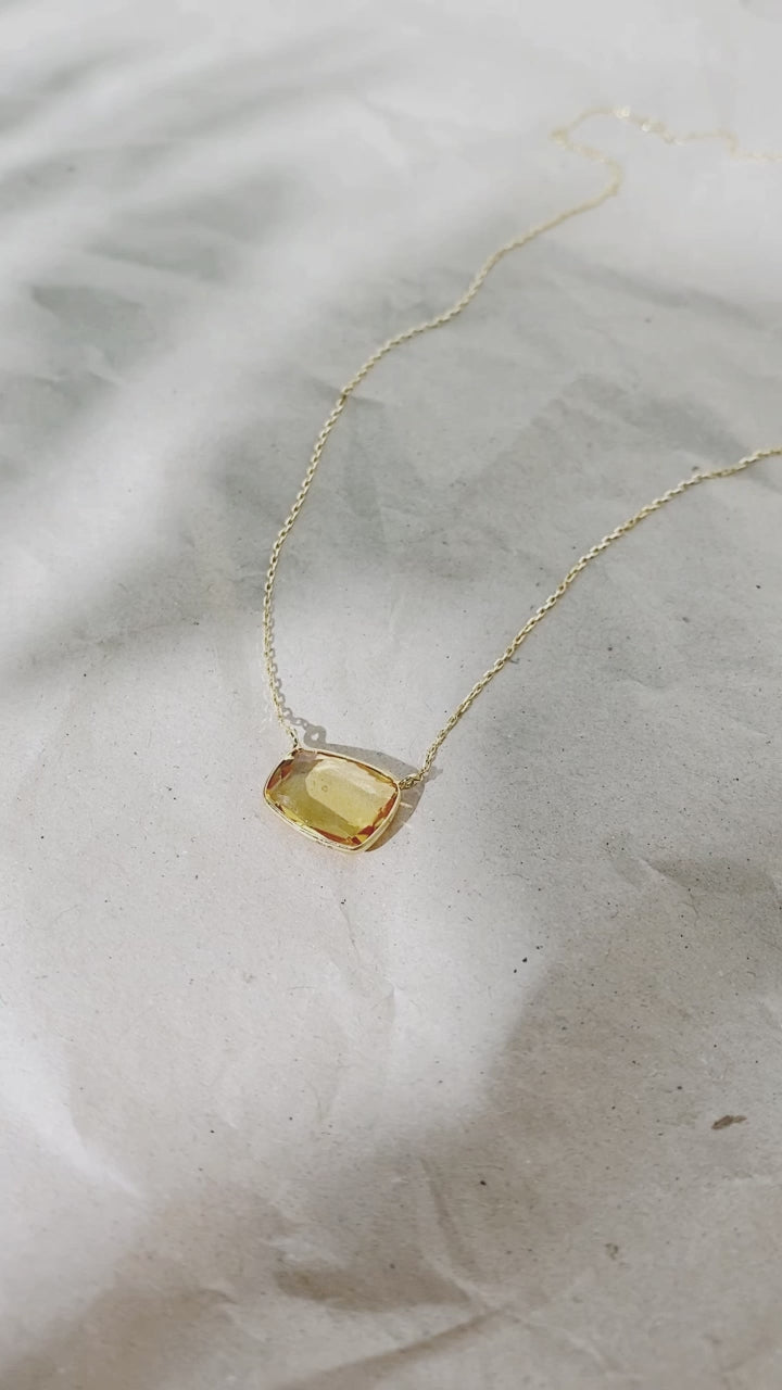 アンイーブンシェイプの色鮮やかな天然石がスタイリッシュなジュエリー。デザイナーが考案したオリジナルカットが、天然石の魅力を引き出し、動くたびに首元できらきらと輝きます。太陽の光のように明るいエネルギー持つ、温かみのあるオレンジ色が美しいシトリン。石言葉は「希望」「富」「生命力」です。古くから「幸運の石」として大切にされ、財運・繁栄・富をもたらすと言われるシトリンは、豊かな暮らしを願う人、心を明るいパワーで満たしたい人に特におすすめです。肌馴染みの良い優しい色合いで、デコルテを美しく引き立ててくれます。アジャスターが付いているので、長さを調節いただけます。