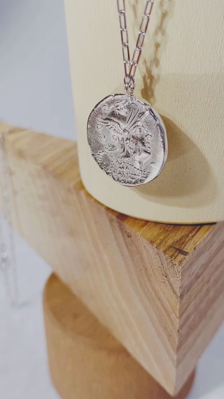 悠久の時の流れと古代ロマンの神秘を感じさせる「Ancient Memories」。ギリシャ神話の神々や偉大な王の肖像が静かに佇むコインモチーフをあしらったネックレスは、心にフィットするデザインや意味からお選びいただけます。表には全知全能の神ゼウスの最愛の娘で、知恵と闘いの女神である水の神アテナ、裏みは力強いWarrior(戦士)が刻まれた「Athena/Warriors(アテナと戦士)」モチーフは「知性」「リーダーシップ」「平和」そして大切なものや人を守る強さを望む人に特におすすめ。スタイリッシュな印象のシルバーカラーのコインに合わせたのは、存在感のあるレクタングルチェーン。性別を問わず幅広くお楽しみいただけるのも魅力。アジャスター管付きで長さを調節いただけます。「Silent Rain」のチェーンネックレスと合わせるスタイリングもおすすめです。