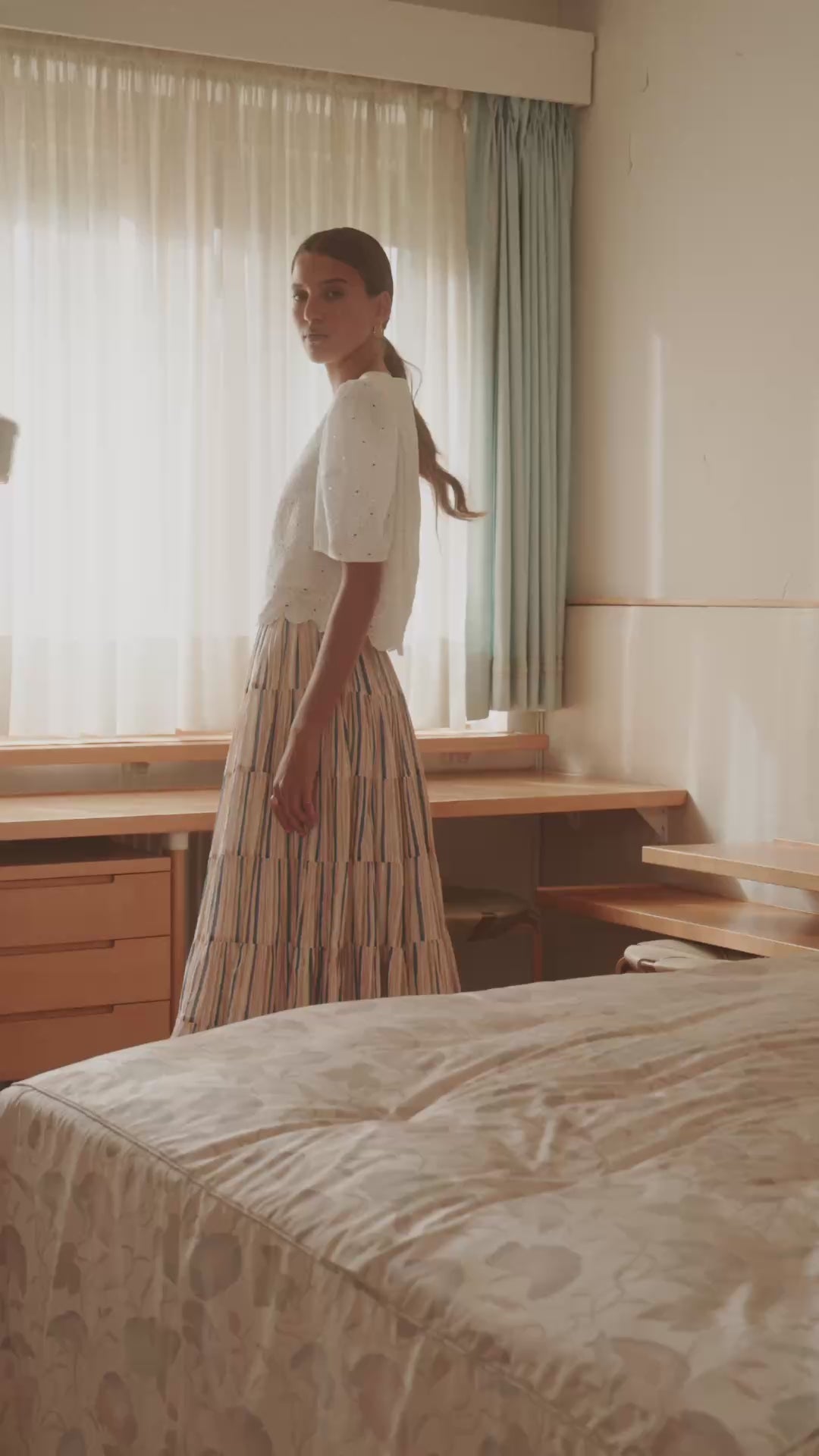 空に浮かぶ七色の虹をイメージしてデザインされた「草原の虹のスカート」は、シンプルなトップスに合わせるだけで華やかな雰囲気を演出できる人気のデザインです。上質なコットン素材を使用した、軽やかでボリューム感のあるスカートは、動きに合わせて揺れる裾が魅力的。華奢なサンダルをあわせてフェミニンに、スニーカーを合わせてカジュアルにと、あわせるアイテムで印象が変わります。